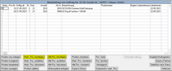 Möchten Sie nur einzelne Positionen bestätigen, so steht Ihnen hierzu der Button Mark. Pos. bestätigen zur Verfügung. Vorab markieren Sie die zu bestätigenden Positionen (Siehe Anleitung zum Markieren einzelner Positionen.)