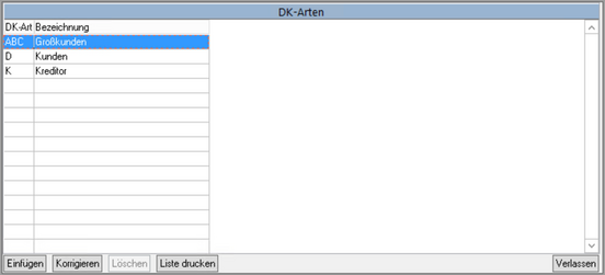 Gehen Sie ins Menü Stammdaten/Verwaltung/Schlüsseltabellen/Deb.-Kred-Arten.