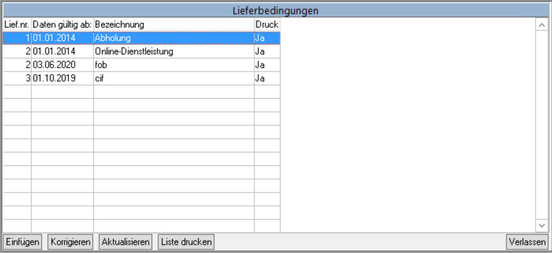 In diesen Fenster sehen Sie die aktuell hinterlegten Lieferbedingungen.