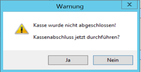 Es wird eine Prüfung vorgenommen, ob der Tagesabschluss durchgeführt wurde. Sollte dies nicht der Fall sein, erfolgt eine Warnung: