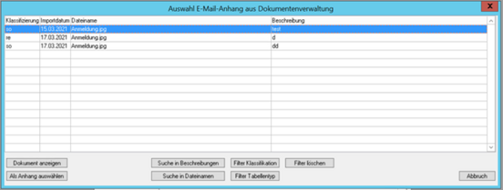 Aktivieren Sie das gewünschte Dokument und drücken dann Als Anhang auswählen. Anschließend ist die Anzahl um 1 gestiegen und der Name des Dokumentes erscheint bei Anhang. Je nachdem, welche Nummer Sie anwählen, erscheint nun ein anderer bzw. kein Dokumentenname.