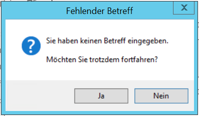 Haben Sie versäumt, den Betreff einzugeben, können Sie den Vorgang an dieser Stelle nochmals abbrechen, um dies nachzuholen. Klicken Sie dazu Nein. Sie können jedoch die Mail auch ohne Betreffzeile senden, indem Sie Ja klicken.