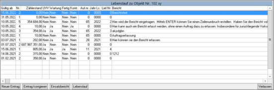 Sie finden alle Lebenslaufeinträge zu dem gewählten Objekt. Dabei finden Sie die aktuellsten Einträge oben.