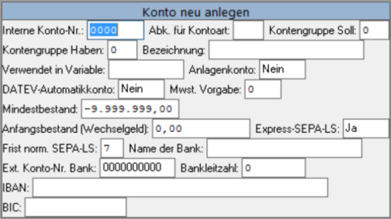 Express-SEPA-LS | Bietet Ihre Bank Express-SEPA Lastschrift an, füllen Sie dieses Feld für das entsprechende Konto mit Ja. |