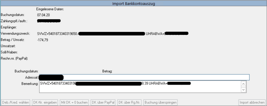 Bei Buchung überspringen, wird dieser Datensatz aus dem Bankkontoauszug nicht gebucht. Bitte holen Sie dieses im Anschluss manuell nach. Siehe hierzu auch Kontoauszug buchen.