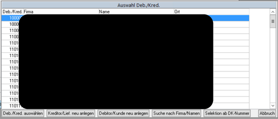 Über den Button Deb./Kred, können Sie nach dem Namen bzw. der Firma suchen.