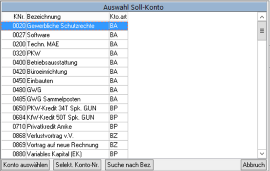 Falls die Kontonummer nicht bekannt ist, löschen Sie die Konto-Nr.. Es wird Ihnen dann eine Auswahl der Konten angezeigt. Analog funktioniert das bei Einnahmen mit dem Haben-Konto.