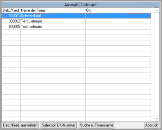 Über den Button Deb/Kred. auswählen wählen Sie den aktiven Lieferanten aus.