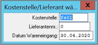 Wählen Sie die Kostenstelle, die Lieferantennummer sowie das Datum aus (der aktuelle Tag wird vorgegeben). Wissen Sie die Lieferantennummer nicht, so lassen Sie die 0 stehen. Es erscheint dann eine Auswahlliste, in der Sie auch nach dem Namen suchen können.