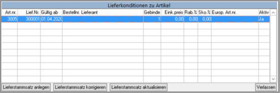 Es werden alle Artikel des ausgewählten Lieferanten angezeigt, die mit Lieferkonditionen hinterlegt sind.