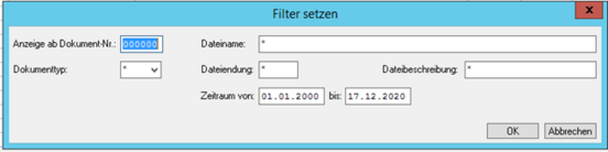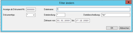 Die vorbelegten Sternchen sind ein Platzhalter für „Alle“. Wenn Sie dies so lassen, erscheinen beispielsweise die Dokumente mit allen Dokumententypen mit den anderen gewählten Filtern.