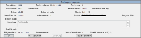 Wählen Sie nun den gewünschten Benutzer aus. Außerdem steht Ihnen das Feld Bemerkung zur Verfügung. Hier können Sie bis zu 50 Zeichen zur Information für den Nutzer eingeben, der das Dokument freigeben soll. Anschließend können Sie den Buchungssatz mit OK oder OK + Dokumentwie gewohnt speichern.