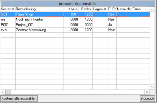 Geben Sie die Kostenstelle ein und drücken Sie Enter. Falls Sie die Kostenstelle nicht kennen, leeren Sie das Feld. Es wird dann ein Auswahlfenster der Kostenstellen angezeigt.