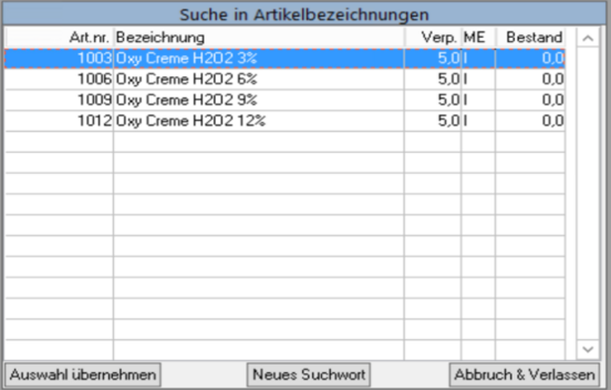 Alternativ können Sie die Suche nach Bezeichnung nutzen. Hierbei ist es möglich, einen Teil der Bezeichnung einzugeben. Es müssen nicht zwangsläufig die ersten Zeichen eingegeben werden. Im folgenden Beispiel wurde als Text „Creme“ erfasst.