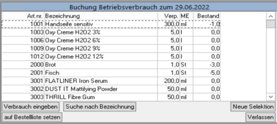 Rufen Sie hierzu (Betriebs-)Verwaltung/Warenwirtschaft/Betriebsverbrauch auf.