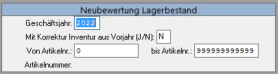 Möchten Sie die Inventur aus dem Vorjahr ebenfalls neu bewerten, dann setzen Sie im Feld Mit Korrektur Inventur aus Vorjahr (J/N) ein J. Dies wird benötigt, wenn man im Vorjahr noch etwas geändert hat. Dadurch wird sich der Wert zum Jahresende ändern und mit einem Ja in dem Feld wird auch die Inventurübernahme korrigiert.