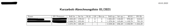 Abrechnungsliste Kurzarbeitergeld (KUG)