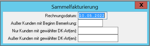 Wählen Sie das Rechnungsdatum aus (vorgegeben wird das aktuelle Datum). Über die anderen Felder können Sie Kunden selektieren. Dies kann entweder über den Beginn des Bemerkungsfeldes des Kunden (geben Sie hierzu die relevanten Zeichen ein), oder über die DK-Arten erfolgen. Bei den DK-Arten können Sie entweder nur Kunden mit bestimmten DK-Arten wählen oder selbige ausschließen.