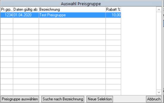 Falls die gewählte Preisgruppe nicht existiert, dann erscheint ein Fenster zur Auswahl der Preisgruppe: