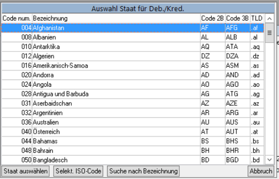 Der Staat ist vorbelegt mit 276 für Deutschland. Handelt es sich um einen ausländischen Lieferanten, so wählen Sie hier die „000“. Beim Speichern des Stammsatzes (am Ende!) erscheint eine Auswahl der Staaten: