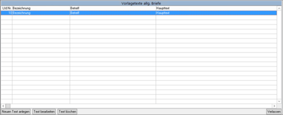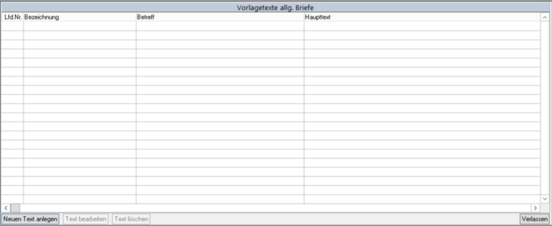 Rufen Sie Stammdaten/Verwaltung/Schlüsseltabellen/Texte für allg. Briefe auf.