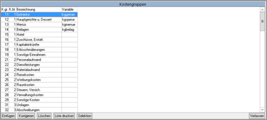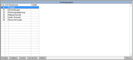 Es öffnet sich das Fenster mit allen vorhandenen Kostengruppen.