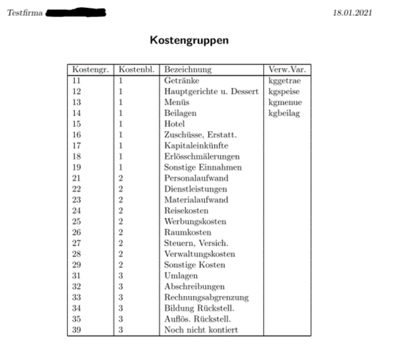 Über den Button Liste drucken erhalten Sie eine Gesamtliste aller Kostengruppen inkl. der Kostenblöcke, Bezeichnung und Variablen.