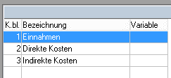 Die Kostenartenblöcke sind in Einnahmen, direkte Kosten und indirekte Kosten eingeteilt.