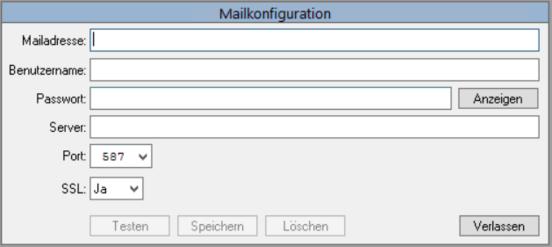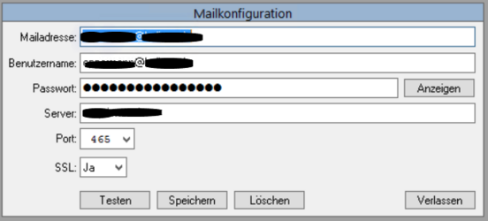 Erfassen Sie nun die Mailadresse, den Benutzernamen, das Passwort, den Ausgangsserver, den Ausgangsport und ob SSL verwendet wird oder nicht. Die SSL-Verwendung wird abhängig vom Port vorbelegt.