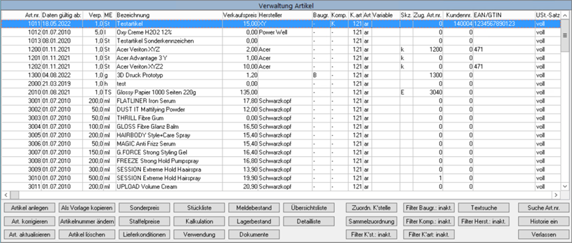 Im Menüpunkt Verwaltung/Artikel- u. Dienstleistungs Verw./Artikel öffnet sich folgendes Fenster.