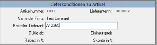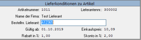 Mit F2 wird der neue Artikel gespeichert und es öffnet sich das Fenster der Lieferkonditionen zu Artikel.