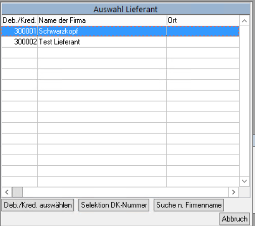Wählen Sie dann den gewünschten Lieferanten, indem Sie ihn markieren und auf Deb./Kred auswählen drücken.