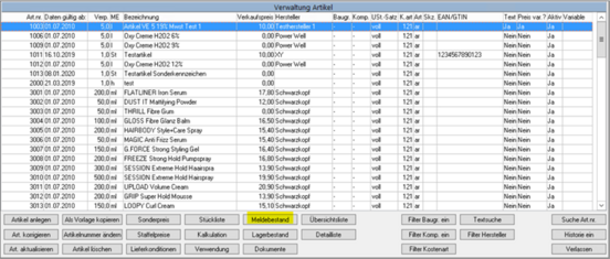 Wählen Sie den zu bearbeitenden Artikel mittels Textsuche oder Suche. Art.Nr. aus (Der Artikel ist nun blau hinterlegt). Drücken Sie den Button Meldebestand.