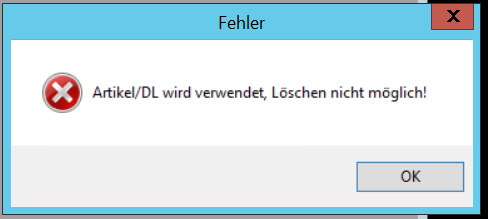 Eine Dienstleistung lässt sich nur löschen, wenn diese nicht bereits in Angebotspaketen oder Aufträgen verwendet wird. Ansonsten erscheint eine Fehlermeldung:
