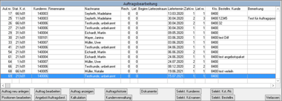 Entweder bearbeiten Sie den Auftrag, den Sie eben erstellt haben (siehe Auftrag neu anlegen) , oder Sie rufen einen bestehenden Auftrag über Aufträge/Angebots- u. Auftragsbearb./offene Angebote n. Kst. auf.
