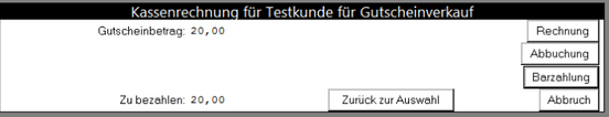 Wenn alles stimmt, wählen Sie Barzahlung buchen aus. Es folgt der Hinweis auf die Gutscheinnummer.